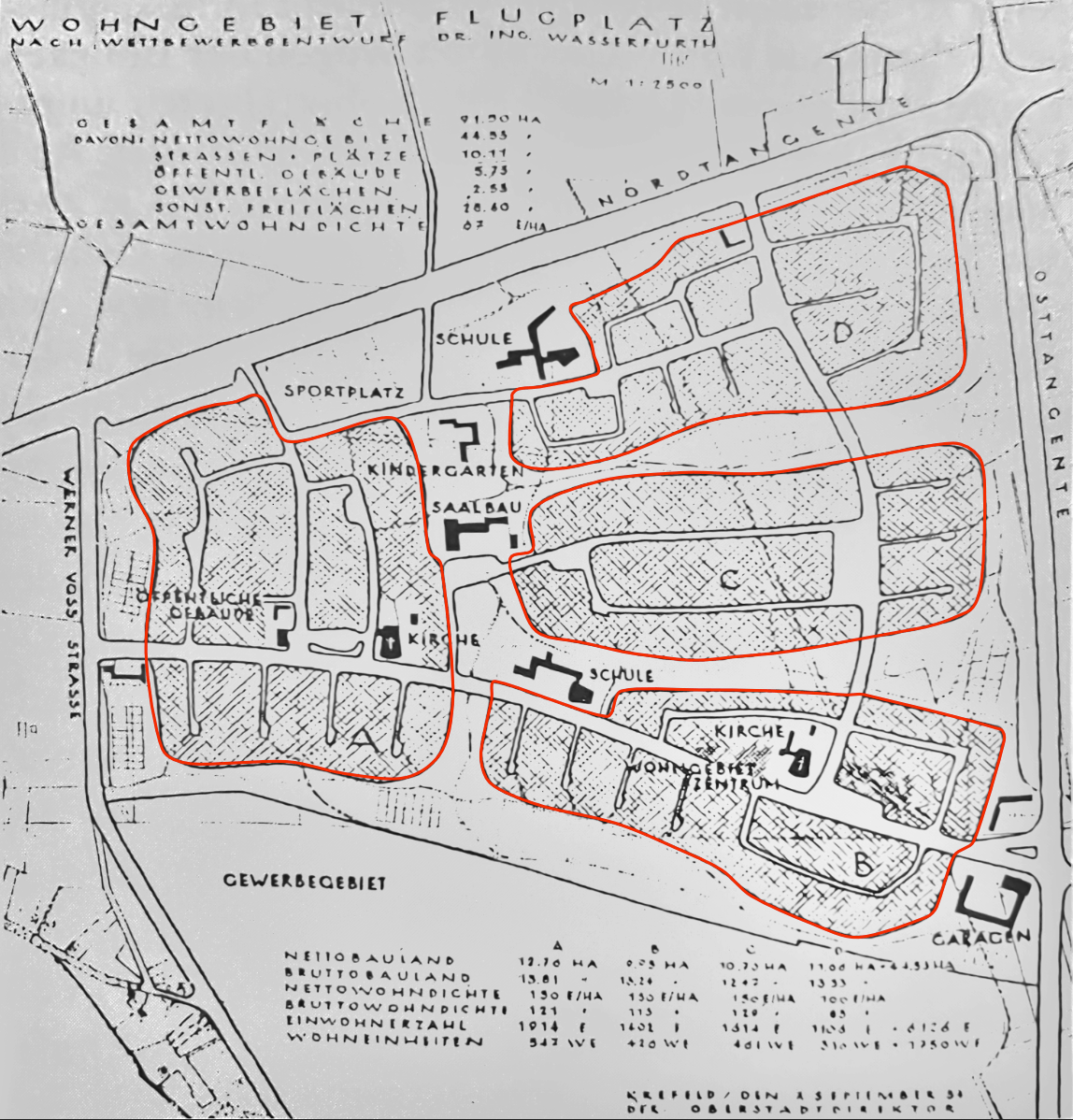 Der Plan Wasserfurths sah vier Bauzonen ABCD vor, die als Knollen bezeichnet wurden und insgesamt 1750 Wohneinheiten enthalten sollten.